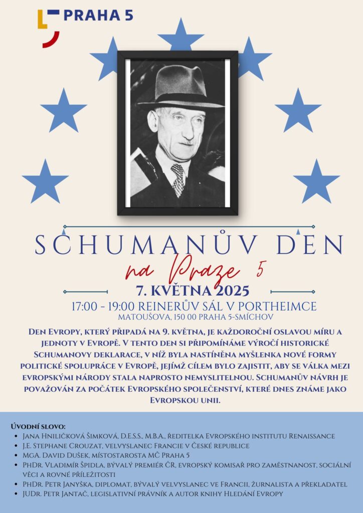Schumanův den je slavnostní událost pořádaná Institutem Renaissance ve spolupráci s městskou částí Praha 5. Každý rok si během tohoto dne připomínáme myšlenku evropské jednoty, spolupráce a míru, jak ji představil Robert Schuman, jeden z otců evropské integrace.