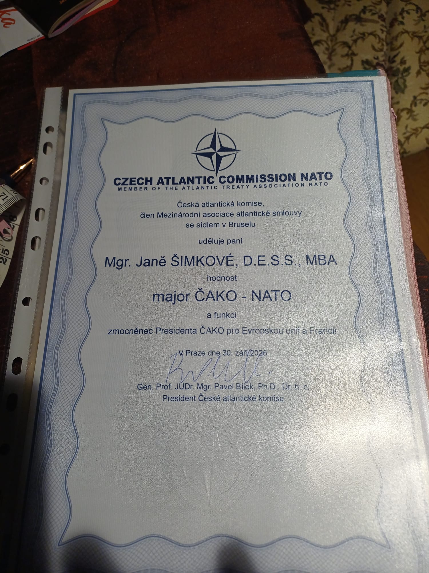 Mgr. Jana Šimková, D.E.S.S., MBA, byla dne 30. září 2025 oceněna Českou atlantickou komisí (ČAKO), členem Mezinárodní asociace atlantické smlouvy se sídlem v Bruselu.